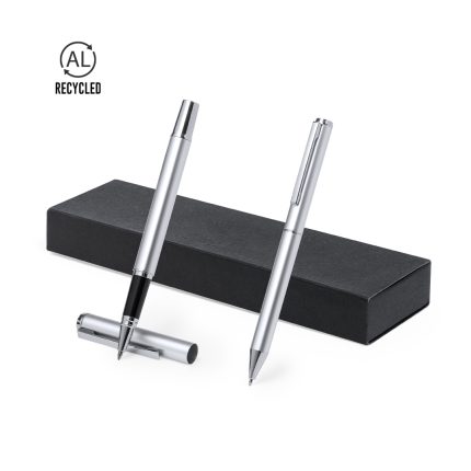 Ξεχωριστό σετ στυλό και roller στυλό, σχεδιασμένα και τα δύο με κομψά μαύρα σώματα αλουμινίου και ροζ χρυσά διακοσμητικά στοιχεία.