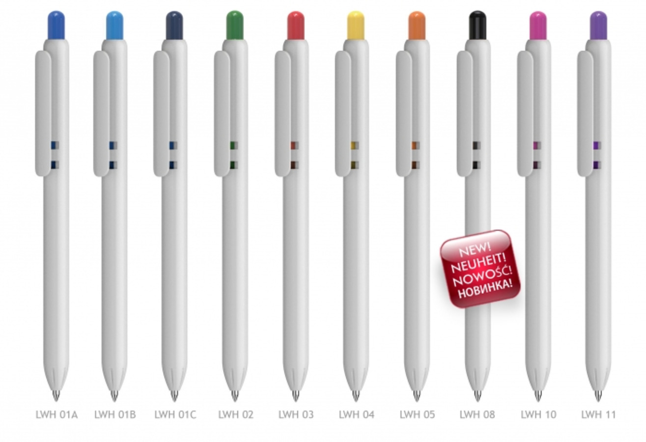 Πλαστικό στυλό με άσπρο σώμα και χρωματιστά button.