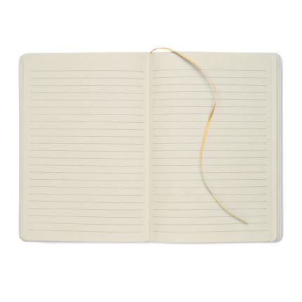 Α5 με σκληρό ανακυκλωμένο κάλυμμα χαρτοκιβωτίου. Μπεζ κάλυμμα. Δεσμευμένη υπόθεση. 160 σελίδες ανακυκλωμένου χαρτιού με γραμμές (80 φύλλα). Ελαστικός ιμάντας κλεισίματος, αντιστοίχιση σελιδοδείκτη κορδέλας με αποκαλυφθέν χρώμα. Μετά τη χάραξη με λέιζερ αποκαλύπτεται το χρώμα.
