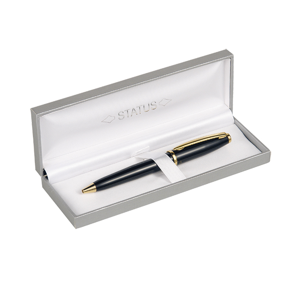 Στυλό Omega πολυτελείας μάρκας STATUS μαύρο με χρυσές λεπτομέρειες σε γκρι κουτί με λευκό σατέν εσωτερικά