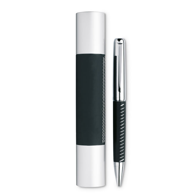 Στυλό μεταλλικό με δέρμα σε θήκη με ασημί λεπτομέρειες .