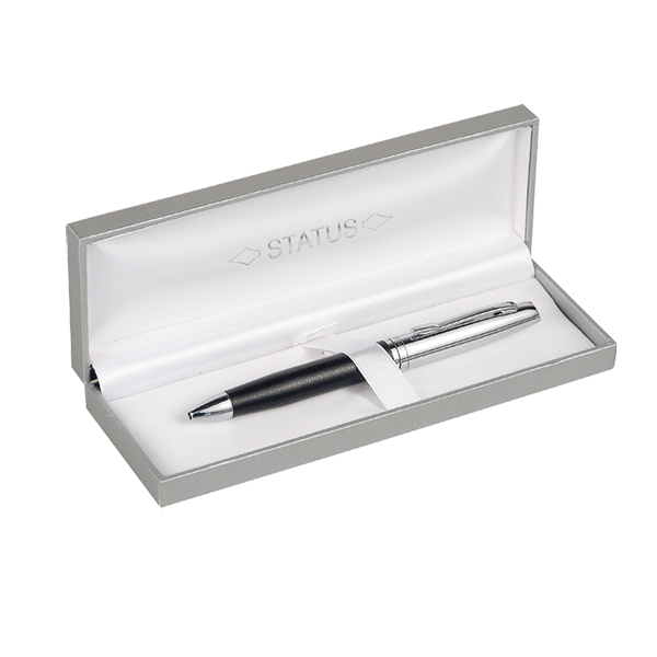 Στυλό prestige πολυτελείας μάρκας STATUS μαύρο τεχνητό δέρμα με ασημί λεπτομέρειες σε γκρι κουτί με λευκό σατέν εσωτερικά