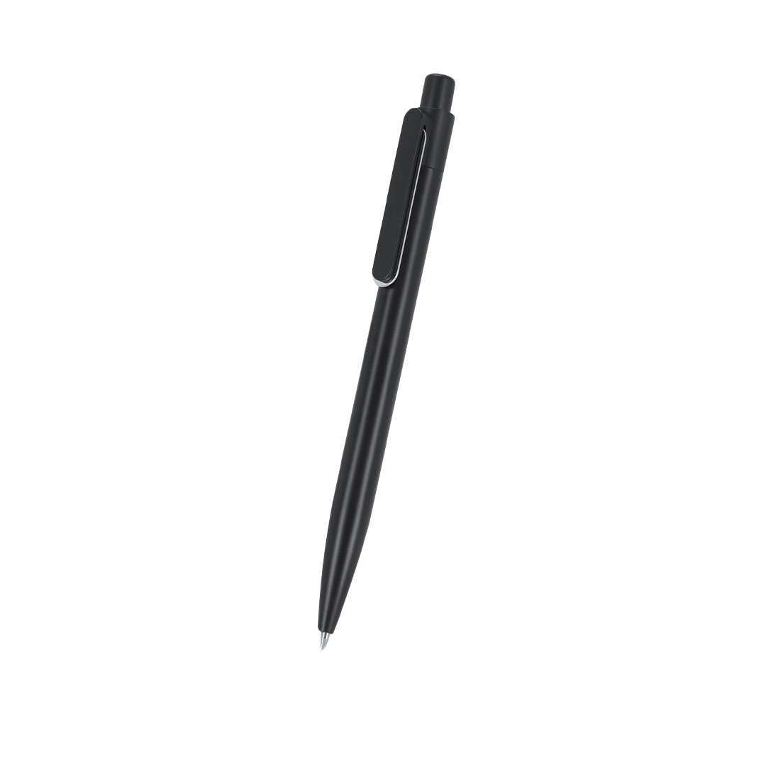 – Ματ μαύρο στυλό διαρκείας κατασκευασμένο από ανακυκλωμένο αλουμίνιο με μηχανισμό ώθησης, κλιπ και διακοσμητικό μεταλλικό στοιχείο.