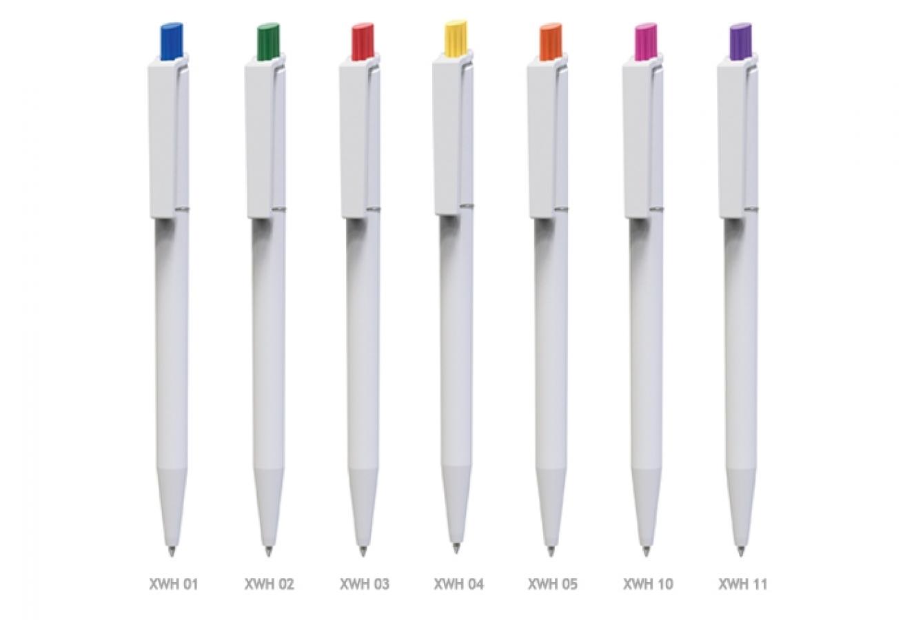 Πλαστικό στυλό με άσπρο σώμα και χρωματιστά button.
